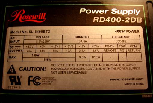 There are a range of ATX12V power supplies available, ranging in price from $15 to over $200. At ~ $35, the Rosewill supply would seem to be a mid-range power supply, but its features put it more on the low end. The RD400-2DB does not have true over-current protection; it only detects a momentary drop in voltage. Also, although the label implies there are two +12V rails, they are connected to the same +12V source inside the supply.