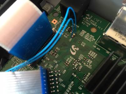 The following picture shows the inside of the player. The blue wires indicated by the red arrows are the wires added for the indicator. The green board is the main control board for the player. The tan board at the front (bottom of picture) is the power supply. The disc drive is on the left and is connected by two ribbon cables.