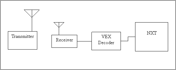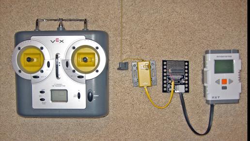 The Lego NXT VEX Decoder provides remote control capability to Lego NXT robotics creations using the VEX robotics transmitter and receiver. The decoder is an adapter that connects the VEX receiver to any sensor port on the Lego NXT brick. The decoder is powered from the Lego NXT brick. Lego NXT programs use the VEX Decoder as a sensor and can respond to the position of the transmitter controls.