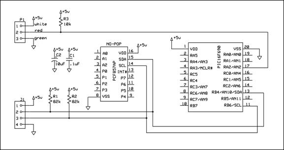 The VEX decoder connects to the Lego NXT brick as an I2C slave using a standard Lego NXT cable and the Lego Jack (J1) provided by the Mindsensors sensor building kit. The VEX decoder connects to the VEX receiver via a single-wire connection using the RJ-10 plug (P1). Power is provided by the Lego NXT brick for the PIC microcontroller and the VEX receiver (via J1).