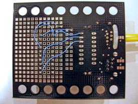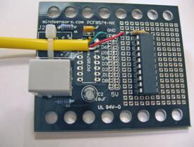 The mindsensor sensor building kit is used as the main circuit board for the VEX Decoder. The PIC16F690 and the 10K pull-up resistor are placed in the board’s prototyping area. The PCF8574 is left off. The VEX receiver cable is cut off and wired to +5V power, ground, and to the 10K pull-up. The yellow wire from the cable is left unconnected. Connections to the prototyping area are made with point-to-point wiring as shown in the following pictures.