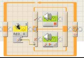 The first example plays a sound when the left-rear transmitter switch is pressed on and stops when the switch is pressed off. The program reads from address 0x48 to get the status of channel 5 (the left-rear transmitter switch). The value is fed into a switch block where it is tested to see if the value is zero. If the value is non-zero a sound is played. If the value is zero the sound is stopped.