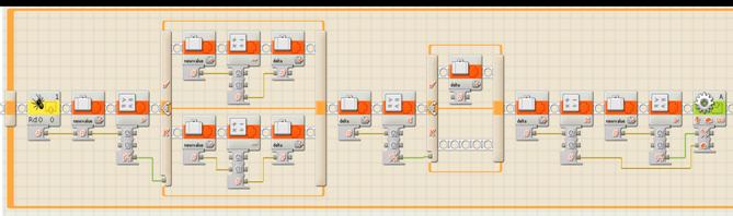 The final set of NXT-G blocks multiply delta by 2 to create a range of 0-100 (approximately) for the motor. Newvalue is compared to 145 to create a logic value for the motor direction. Newvalue greater than 145 produces a TRUE logic value for the motor direction, which sets the motor direction to FORWARD.
